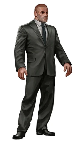 He is a big and tall man, with bright red hair, cut in a military buzz cut, narrow little blue eyes, jutting eyebrows, a thick neck, and a face that looks like it was smashed flat. He looks like a football player, which he was in college.[1] He generally prefers to see things settled in a peaceful manner, but does his job, and is very loyal to John Marcone, although he does give Marcone looks at times to show that he could do things differently.[2]